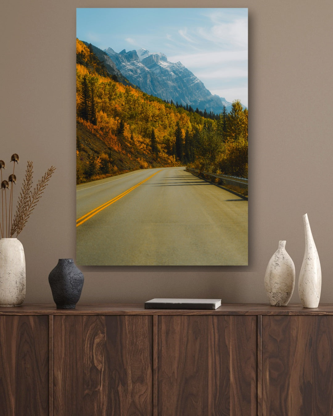 O invitație la libertate și explorare. Drumul se pierde printre culorile toamnei și se îndreaptă către măreția munților, simbol al forței și al visurilor fără limite. Acest tablou aduce energie, optimism și dorința de a merge mereu mai departe. Perfect pentru spații moderne care caută inspirație și vitalitate.