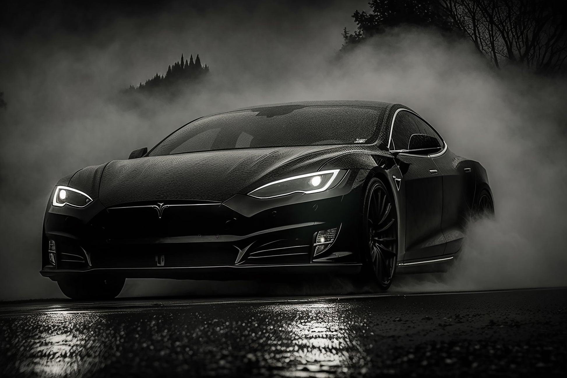 Un tablou misterios și impunător. Tesla neagră, luminată de farurile sale pătrunzătoare, învăluită în fum și ploaie – simbolul viitorului, al puterii și al inovației. O alegere modernă și sofisticată pentru un decor plin de personalitate.